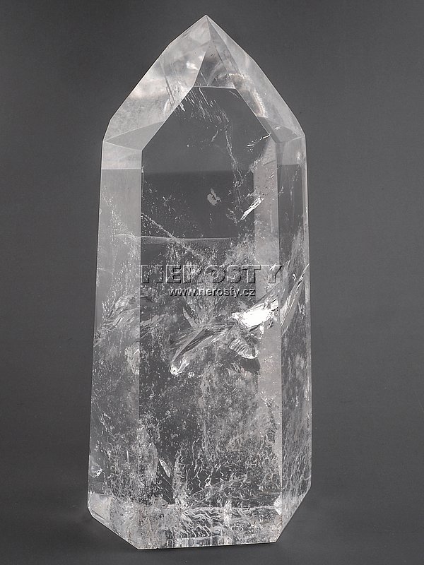 Čirý a leštěním dále zušlechtěný křišťálový krystal se seříznutou podstavou. |