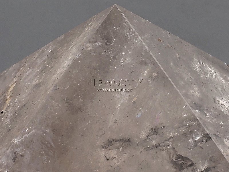 Pyramida z nestejnoměrně probarvené čiré až průhledné záhnědy. |