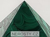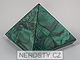 Malachitová pyramida vyrobená ze skládaných a stmelených kusů drahého kamene. |