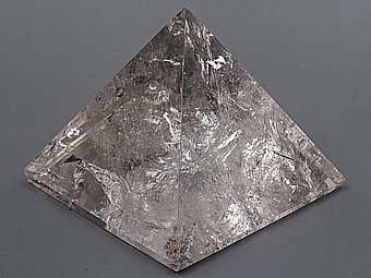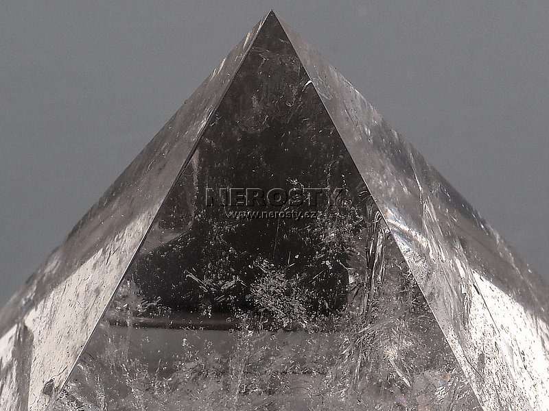 Pyramida z kusu ledově čirého až průhledného křišťálu s minimem růstových poruch.Křišťál má velmi lehounký záhnědový tón.