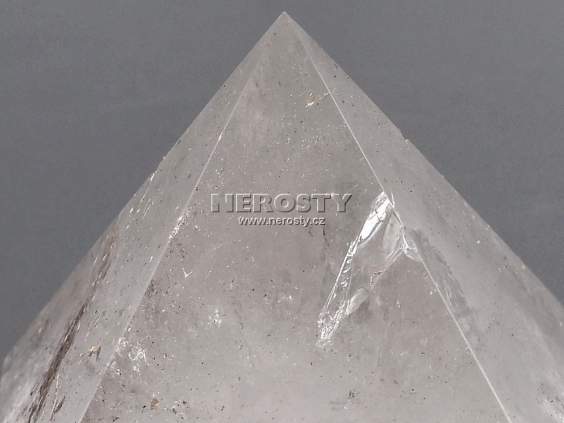 Pyramida z kusu místy mléčně zakaleného křišťálu s obvyklým množstvím růstových poruch. |