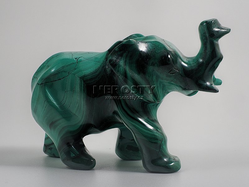 Realisticky ztvárněná figurka slona z dobře vybarveného kusu malachitu se zajímavou kresbou. |