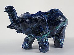 Drobná figurka šťastného slona zhotovená z ušlechtilého vzácného kamene.Na rozdíl od relativně dobře dostupných kusů pěkně vybarveného malachitu je získání vhodného kusu azuritu (či azuritu s příměsí dalších modrých, modrozelených a zelených měďnatých minerálů) mnohem méně obvyklé a podobně neobvyklé je získat z tohoto materiálu dobrý rukodělný výrobek.