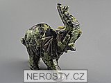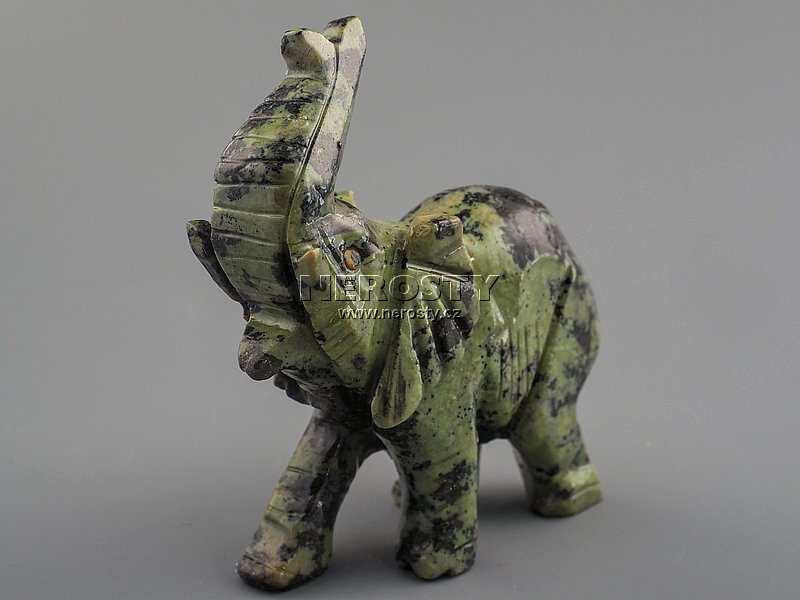 Figurka slona vyrobená z kusu nestejnoměrně probarveného hadce - serpentinitu. |