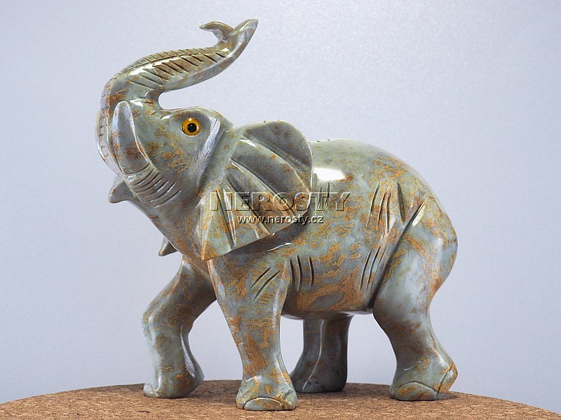 Figurka slona je vyřezaná z šedého, místy okrově zbarveného, vápence.