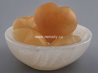 Srdce z oranžového selenitu.Fotografováno na misce o průměru 10 cm. Uvedené rozměry a hmotnost jsou pouze orientační, velikost srdcí vykazuje značné odchylky od uvedených hodnot.