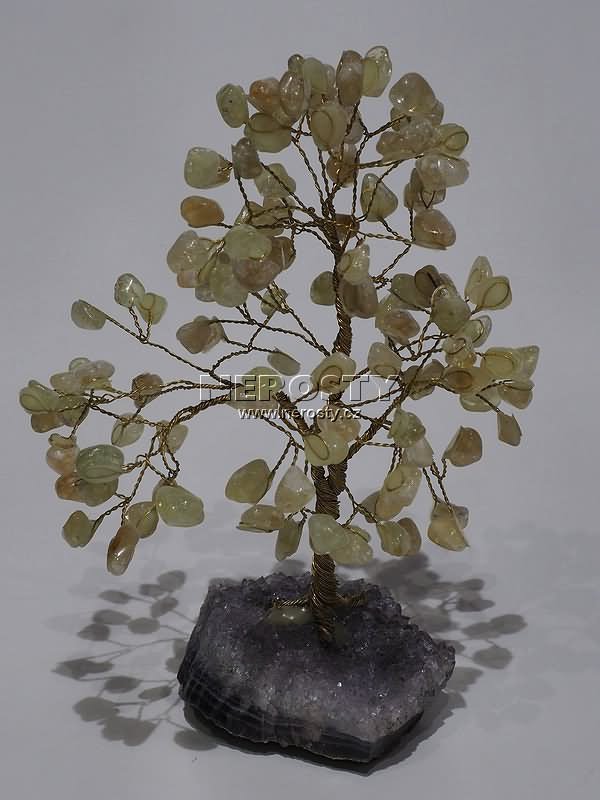 Stromeček štěstí z páleného citrínu. Kmen tvoří zkroucené drátky, podložkou je ametyst. Stromeček lze libovolně natvarovat, uvedená výška je pouze orientační. |
