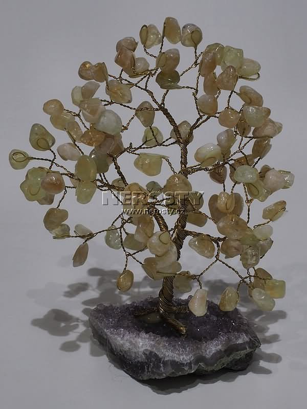 Stromeček štěstí z páleného citrínu. Kmen tvoří zkroucené drátky, podložkou je ametyst. Stromeček lze libovolně natvarovat, uvedená výška je pouze orientační. |