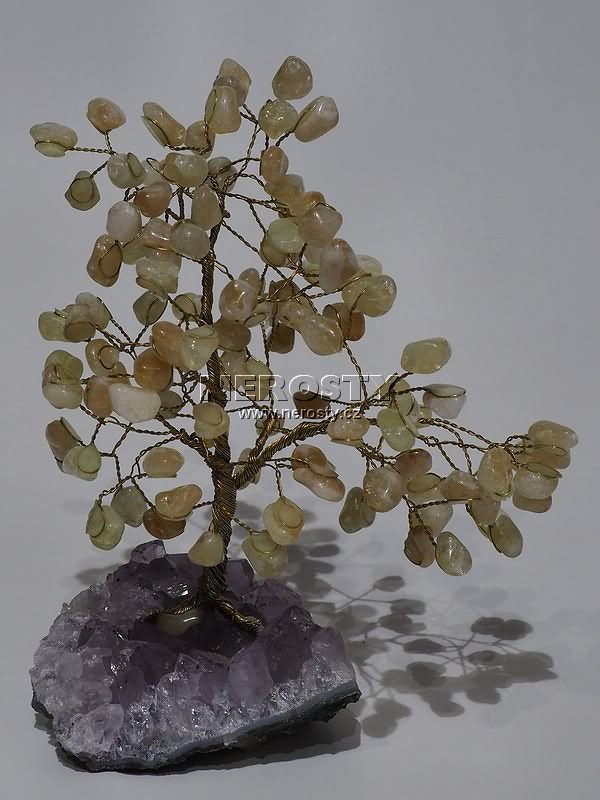 Stromeček štěstí z páleného citrínu. Kmen tvoří zkroucené drátky, podložkou je ametyst. Stromeček lze libovolně natvarovat, uvedená výška je pouze orientační. |