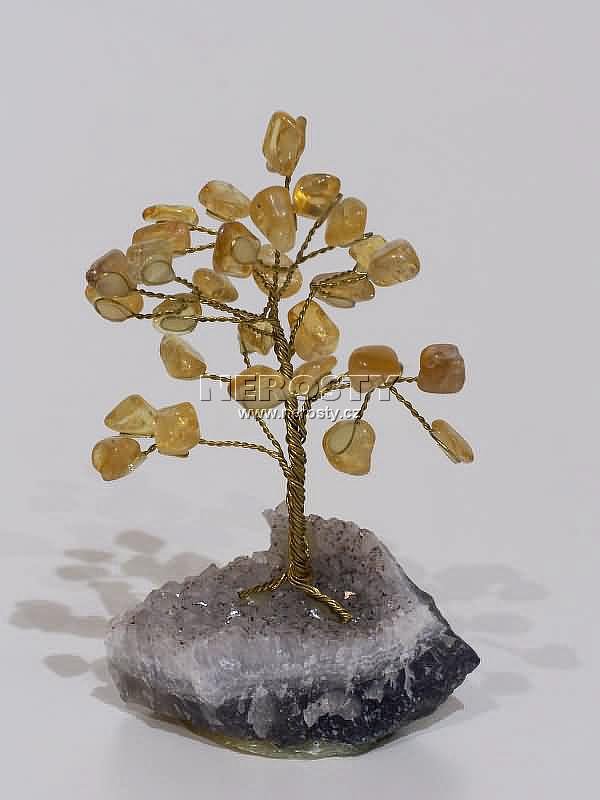 Stromeček štěstí. Kmen tvoří mosazné drátky, podložkou je ametyst. Stromeček lze libovolně natvarovat, uvedené rozměry jsou pouze orientační. |