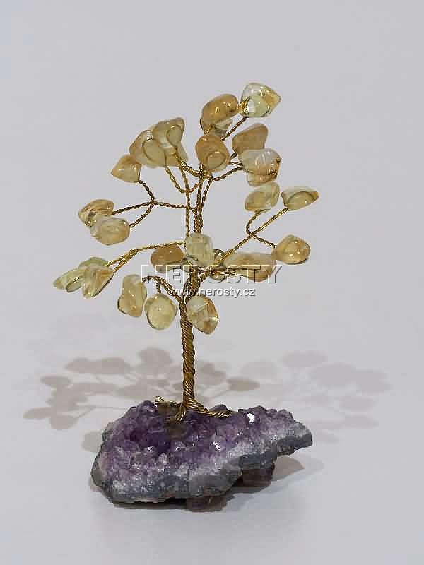 Stromeček štěstí. Kmen tvoří mosazné drátky, podložkou je ametyst. Stromeček lze libovolně natvarovat, uvedené rozměry jsou pouze orientační. |