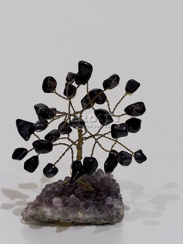 Stromeček štěstí. Kmen tvoří mosazné drátky, podložkou je ametyst. Stromeček lze libovolně natvarovat, uvedené rozměry jsou pouze orientační.