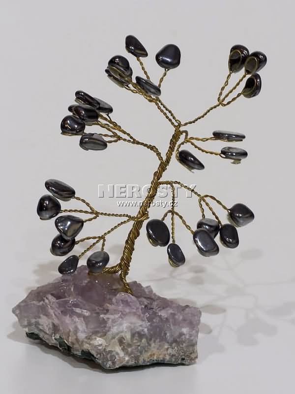 Stromeček štěstí. Kmen tvoří mosazné drátky, podložkou je ametyst. Stromeček lze libovolně natvarovat, uvedené rozměry jsou pouze orientační. |