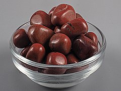 Pravidelné, ručně tvarované a zhruba stejně velké valounky z červeného jaspisu. Tromlovaný kámen čtvercového průřezu.Fotografováno na misce o průměru 5,5 cm. Uvedené rozměry a hmotnost jsou pouze orientační, velikost a tvar kamenů vykazuje drobné odchylky od uvedených hodnot.