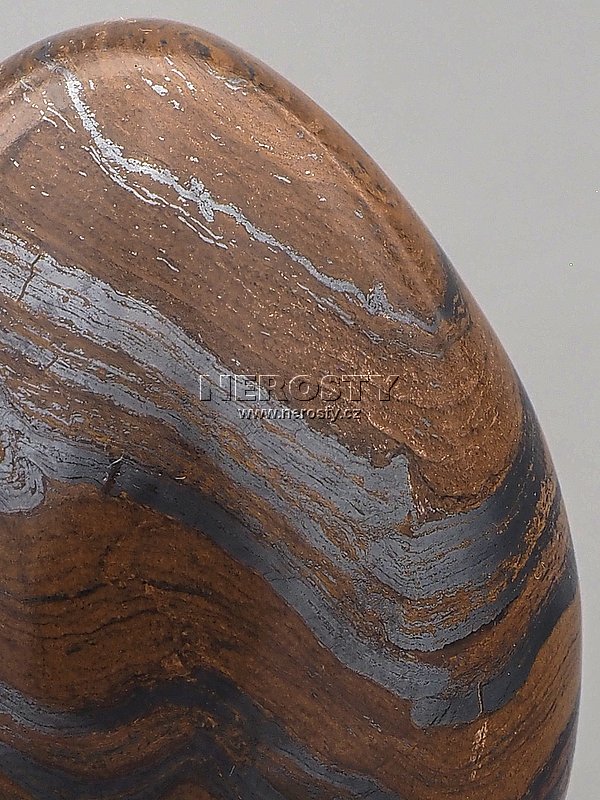 Vejce vyrobené z pečlivě vybraného kusu drahého kamene s výraznou kresbou.Vzor je tvořen střídáním vrstviček hematitu a tygřího oka. Tento materiál bývá označován také jako železné tygří oko.