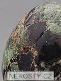 Vejce ze zeleného hnědě skvrnitého opálu.Praskliny jsou přírodního původu a vejce je pevné.