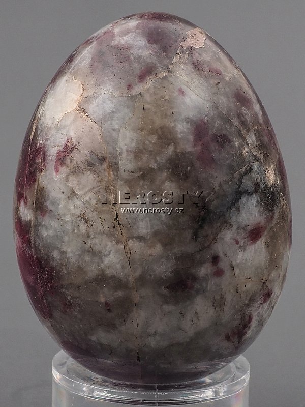 Vejce z pegmatitu s tmavě vínovým rubelitem zarostlým především v křemeni. |