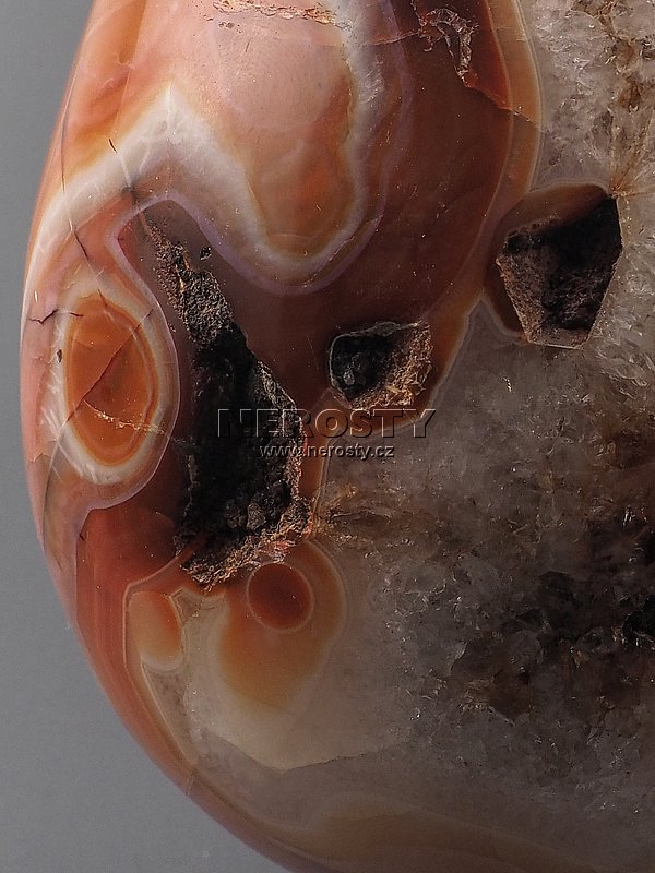 Velké a pěkně vybarvené karneolové vejce s výraznou kresbou a dutinkami s krystaly. |