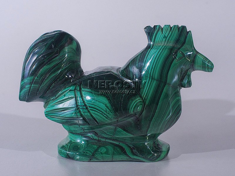 Kohout. Drobná plastika je vyrobena z dobrého kusu malachitu s pěknou kresbou. |