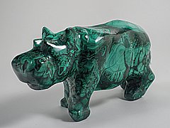 Figurka hrocha vyrobená z jakostního kusu pěkně vybarveného malachitu.Na pravém uchu je drobný kaz který ale nepůsobí nijak rušivě a je patrný především pohmatem.