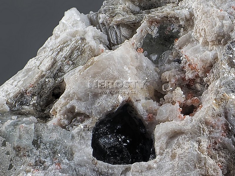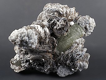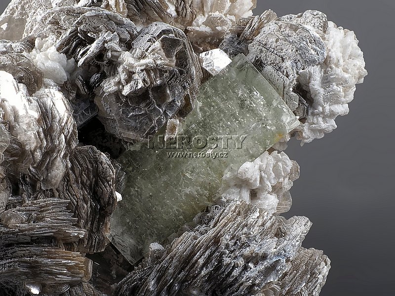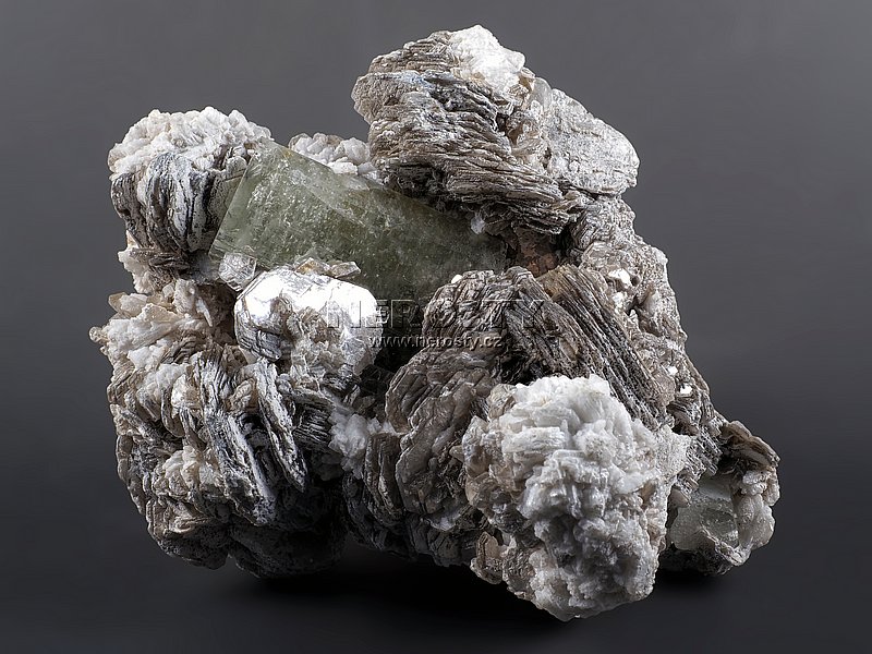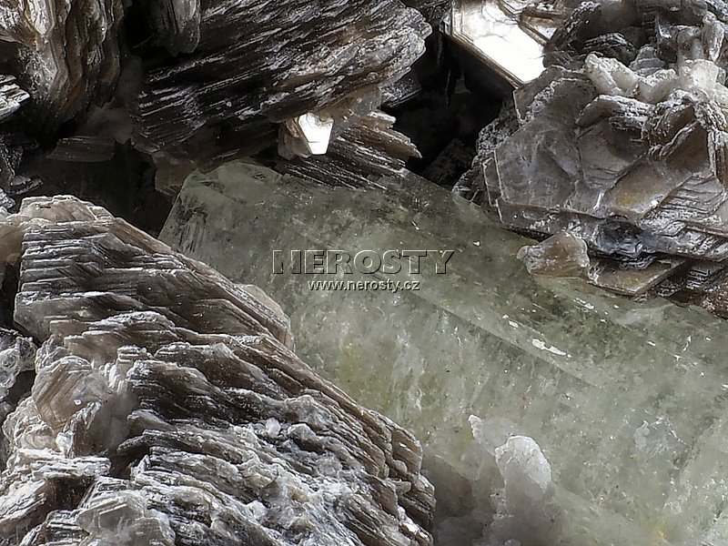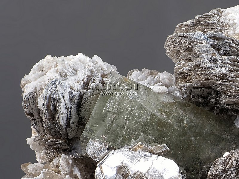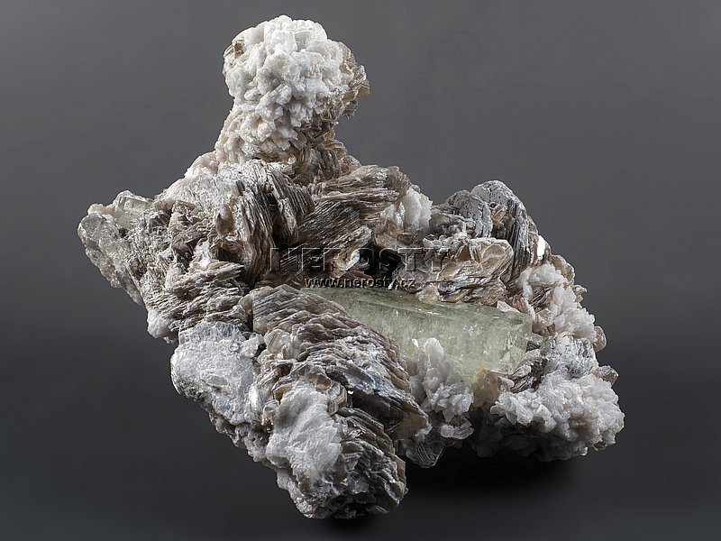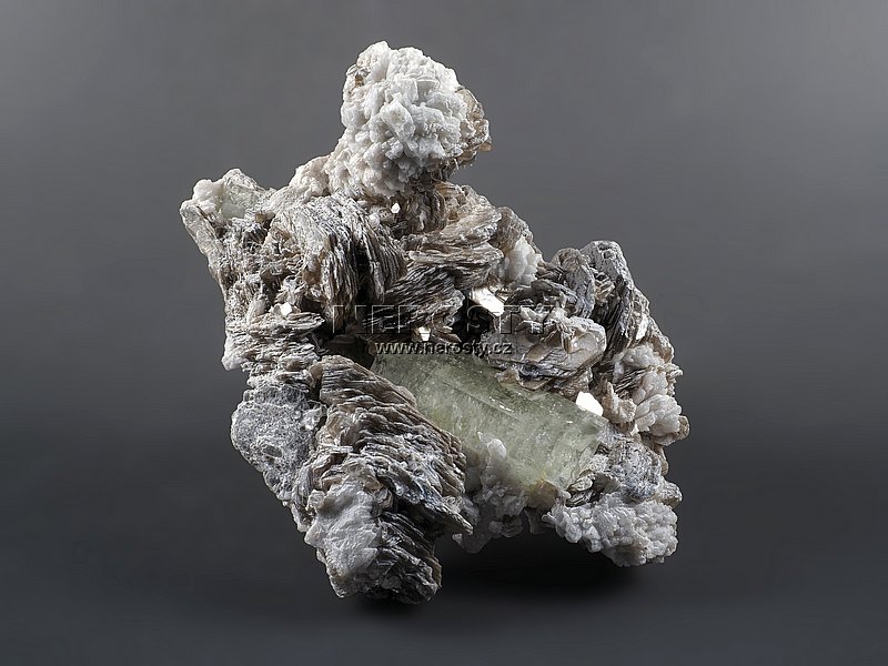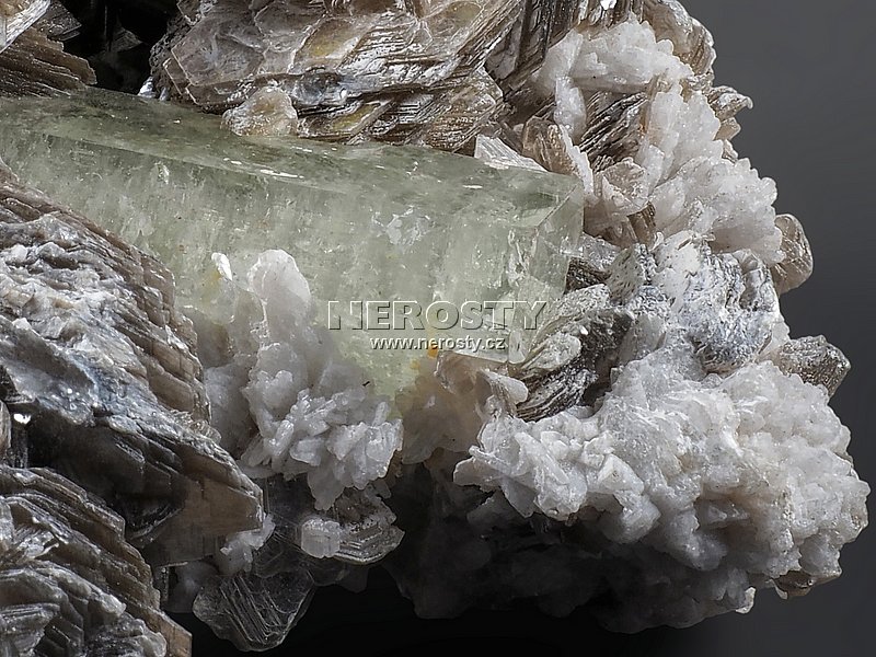 Velký nazelenalý akvamarín uprostřed albitu a muskovitu.Na albitové podložce je mezi lupeny muskovity a drobně krystalovaným albitem ploše narostlý 4,5 cm dlouhý, skelně lesklý a dobře vyhraněný akvamarínový krystal s příjemnou nazelenalou barvou.