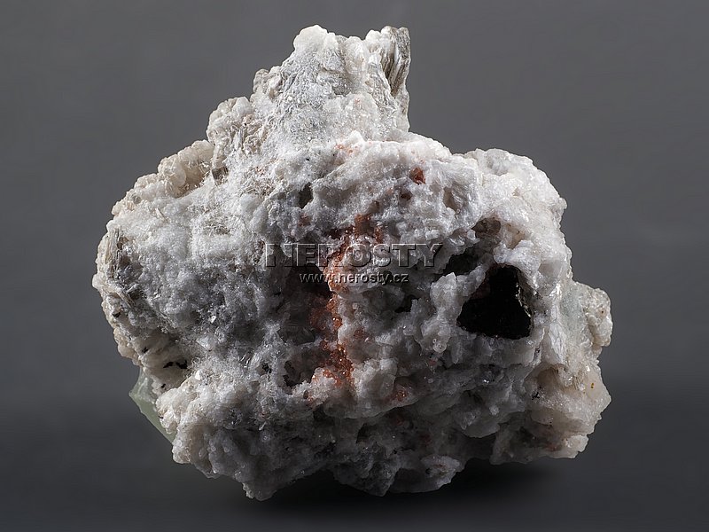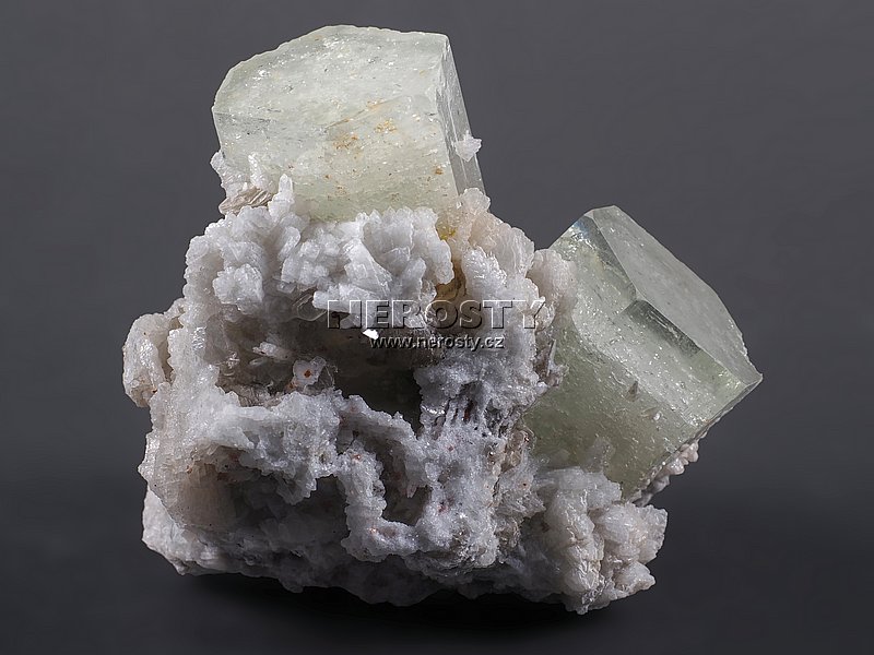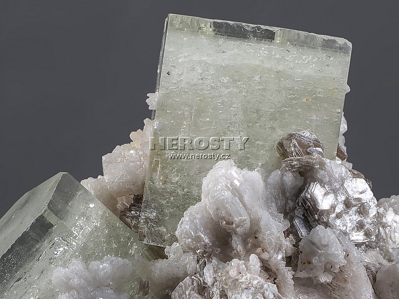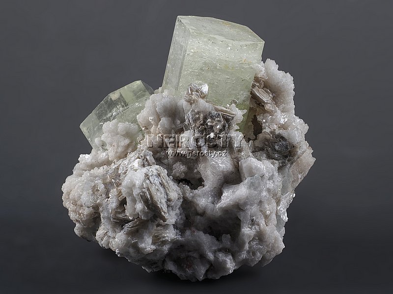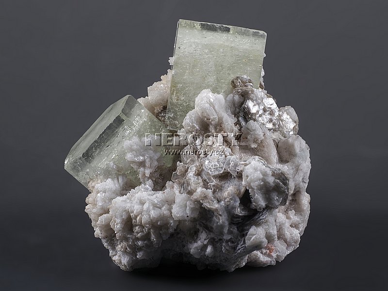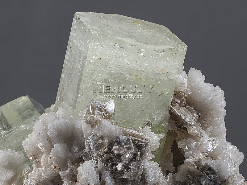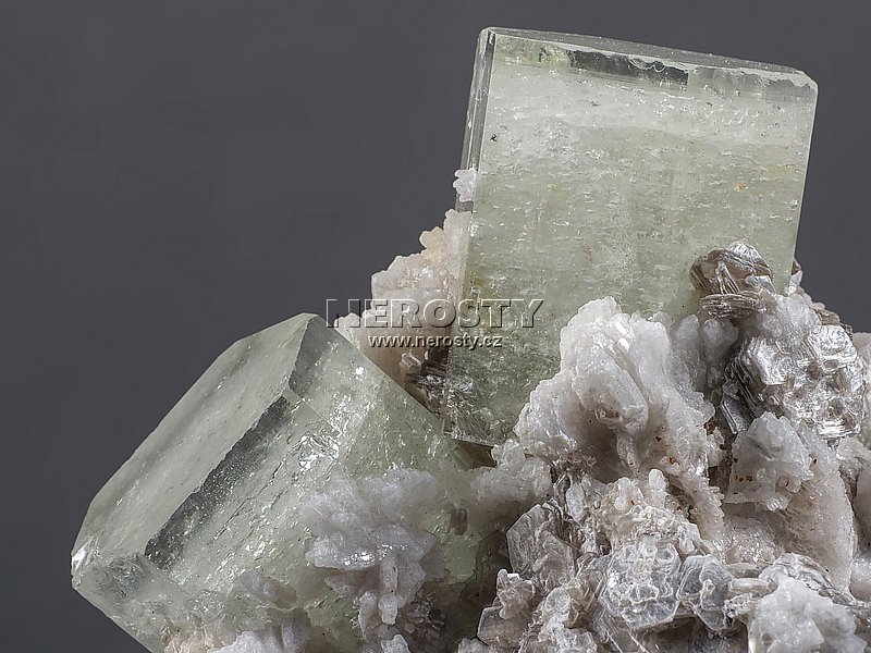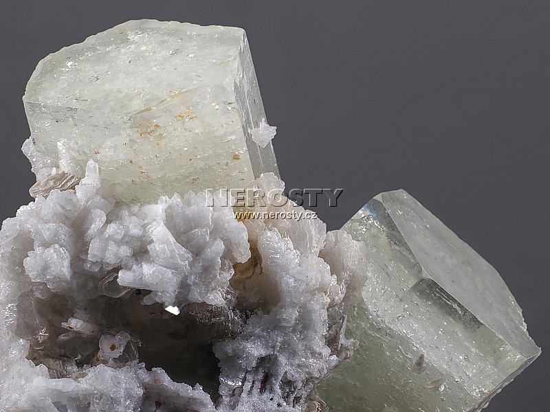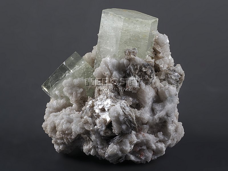 Elegantní ukázka nazelenalých akvamarínových krystalů na albitu.Dva akvamarínové krystaly vyrůstají z podložky tvořené krystaly albitu. Krystaly akvamarínu jsou v části jejich hmoty dokonale průhledné. Kompozici vzorku doplňuje několik lupenitých krystalů muskovitu. V podložce vzorku je zarostlý velmi drobný granát, pravděpodobně spessartin.