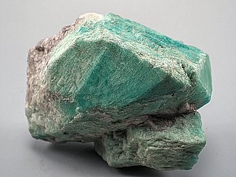 Pastelově zelený amazonitový krystal z Číny.Krystal byl pravděpodobně na více místech přirostlý k hornině což je patrné na jeho povrchu..