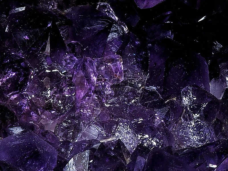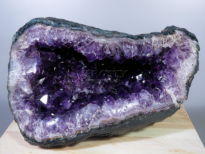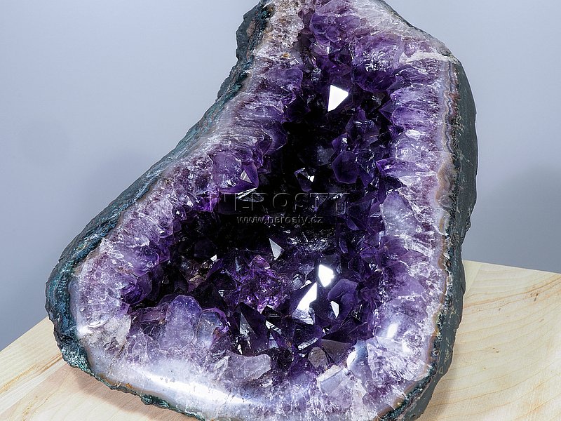 Tato ležatá ametystová geoda je vyplněna opravdu tmavě fialovým ametystem. Špičky krystalů jsou velké maximálně 20 mm. Okraj geody není rovný a je leštěný do vysokého lesku.Geoda byla při těžbě poškozena, uvnitř jsou některé krystaly bez špiček. Při jejím vhodném umístění to však nepůsobí rušivě protože poškození je relativně hluboko uvnitř dutiny.