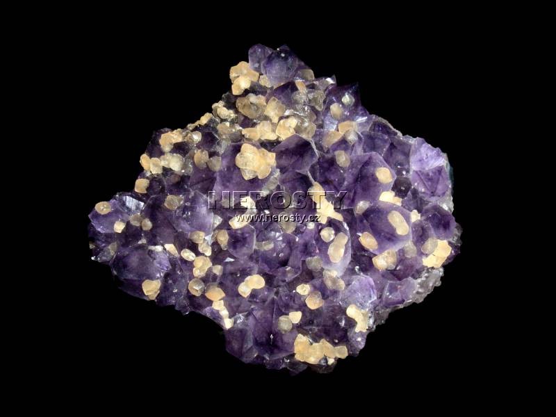 Efektní kombinace tmavých ametystových krystalů porostlých medově žlutým kalcitem. Vzorek může být ozdobou každé sbírky. |