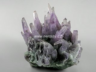 Drúza dlouhých krystalů rudního ametystu.Z křemenné podložky vyrůstají relativně tenké, protáhlé a až 7 cm dlouhé nerovnoměrně probarvené levandulově fialové krystaly ametystu.
