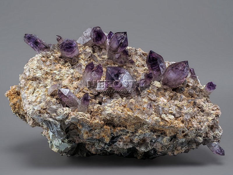 Krystaly ametystu na podložce z hrubého pegmatitu.Z pegmatitové podložky vyrůstají až 2 cm dlouhé,nestejnoměrně fialově vybarvené a lesklé ametystové krystaly. Některé z nich jsou oboustranně ukončené s jednou špicí vrostlou do podložky. Dva krystaly v pozadí mají žezlovitý růst.