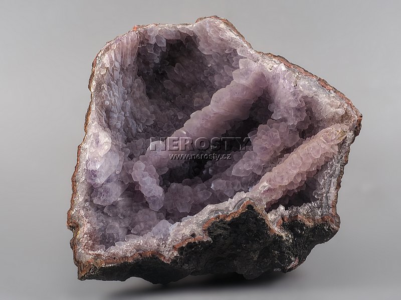 Část marocké geody vyplněné krystaly pastelově fialového ametystu.Její okraj je tvořen červeným achátem, výplň pak světlým zdánlivě ojíněným pastelově růžovofialovým ametystem který tvoří napříč vzorku hřebínky z krystalů..