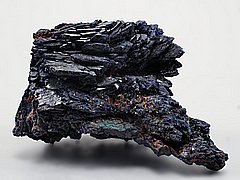 Drúza paralelně narostlých lupenitých krystalů azuritu.Sytě tmavě modré, lesklé, přibližně 15 mm dlouhé a vějířovitě uspořádané kopinaté krystaly azuritu v lupenitých srůstech pokrývají vzorek téměř ze všech stran.