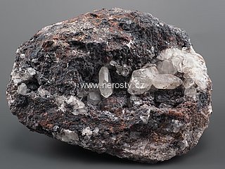 Tlustě tabulkové, čiré krystaly barytu do dvou centimetrů délky v dutině.Uvnitř některých krystalů barytu jsou zarostlé jehlice goethitu. Mezi velkými barytovými krystaly jsou drobné krystaly dolomitu a šedočerný amorfní minerál, pravděpodobně hollandit ve směsi s hematitem.