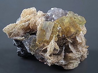 Pestrá kombinace minerálů z marocké lokality Sidi Ayed.Na masivním galenitu jsou narostlé zhruba 15 mm velké kostky žlutého fluoritu a lupeny světle béžového barytu. Kompozici vzorku doplňuje krystalovaný nízce prizmatický křemen. Fluorit pod UV zářením svítí fialově.
