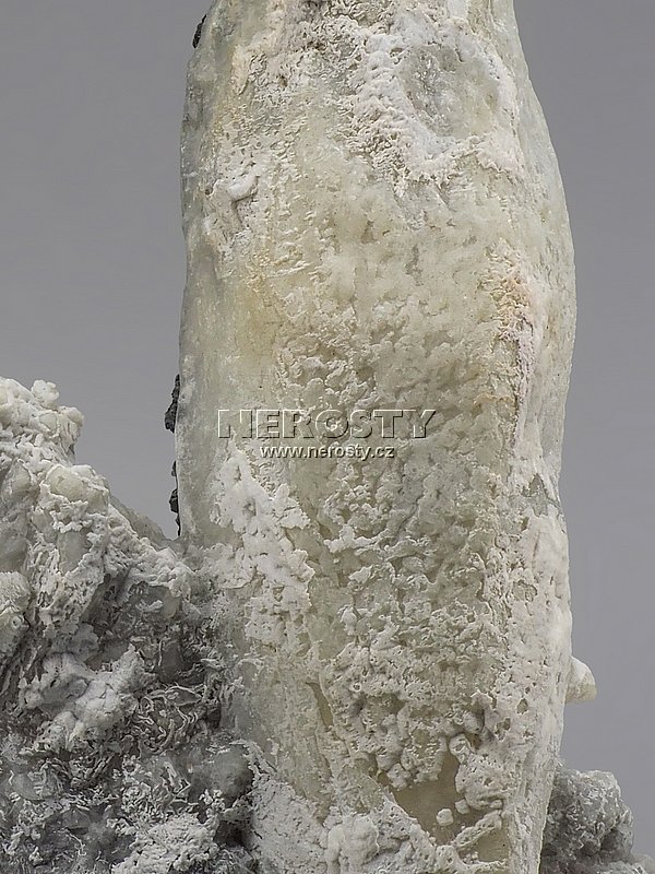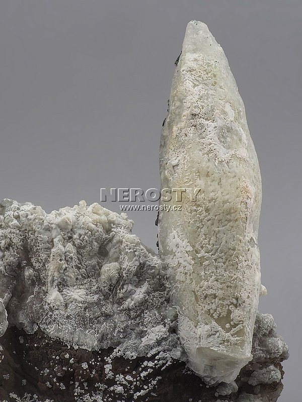 Dlouhý kalcitový krystal nasedlý na ploché chalcedonové podložce.Z tenkého plochého chalcedonového vějíře vyrůstá přibližně 13 cm dlouhý a hrubě rostlý kalcitový krystal.