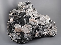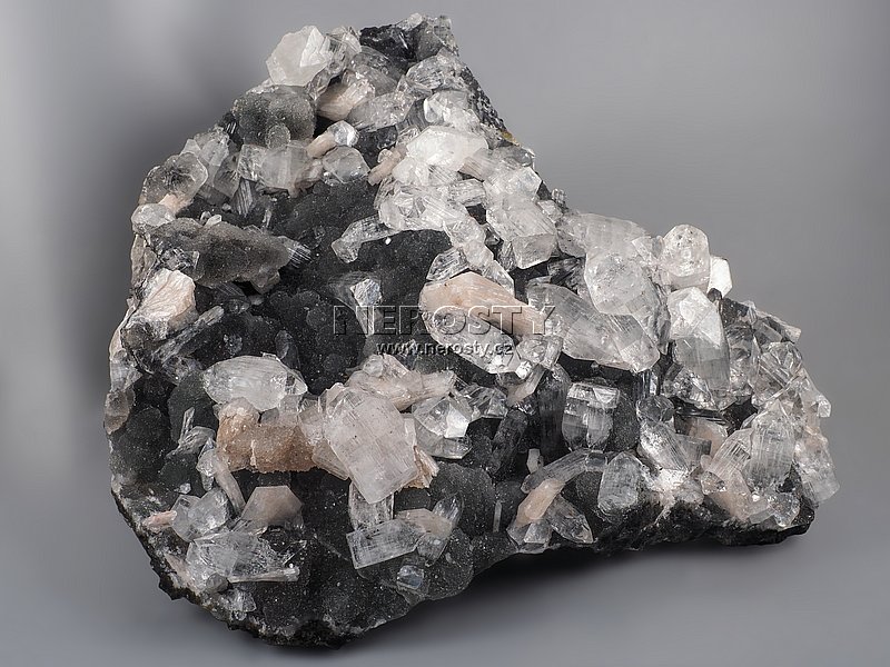 Větší a členitý vzorek hustě porostlý apofylitem na chalcedonu.Plochá bazaltová podložka je zcela porostla drobně krystalickým a klkovité útvary vytvářejícím průsvitným chalcedonem. Na něj hustě narůstají různě velké krystaly čirého a skelně lesklého apofylitu dlouhé až 4 cm. Mezi apofylitem lze nalézt několik světle růžových krystalu stilbitu.