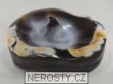 Tenký oboustranně leštěný plátech z nestejnoměrně probarveného průsvitného chalcedonu. |