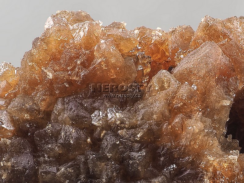 Drúza žlutohnědých krystalů citrínu, volně stojící oboustranný vzorek.Silně lesklé a sytě vybarvené krystaly citrínu z relativně nové marocké lokality. Barva tohoto citrínu je označována jako hnědý cukr. Nejdelší krystal měří zhruba 2 cm.