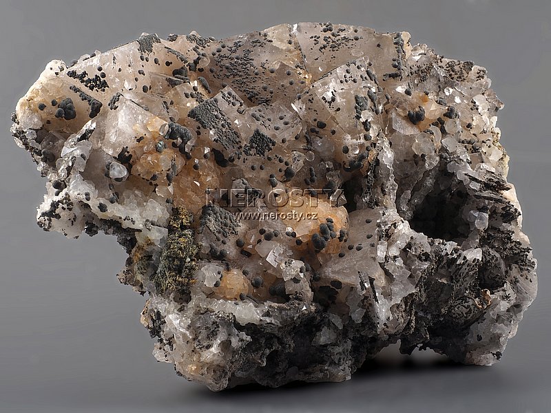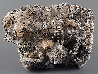 Pěkná ukázka fluoritu v kombinaci s křemenem.Až 3 cm velké krystaly bílého až světle béžového lesklého a nedokonale průsvitného fluoritu jsou narostlé na prokřemenělé podložce. Fluorit prorůstá krystalovaný křemen a pyrit který často tvoří drobné sférické agregáty.