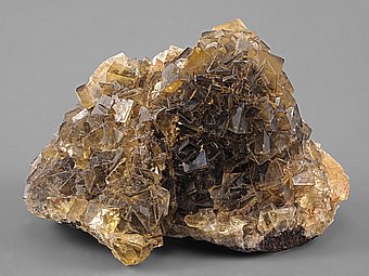 Pěkná ukázka sytě žlutooranžových krystalů fluoritu z Namibie.Vzorek je tvořen mnoha prorostlými krychlovými krystaly fluoritu které jsou dokonale vyhraněné, lesklé a dobře průsvitné až průhledné.