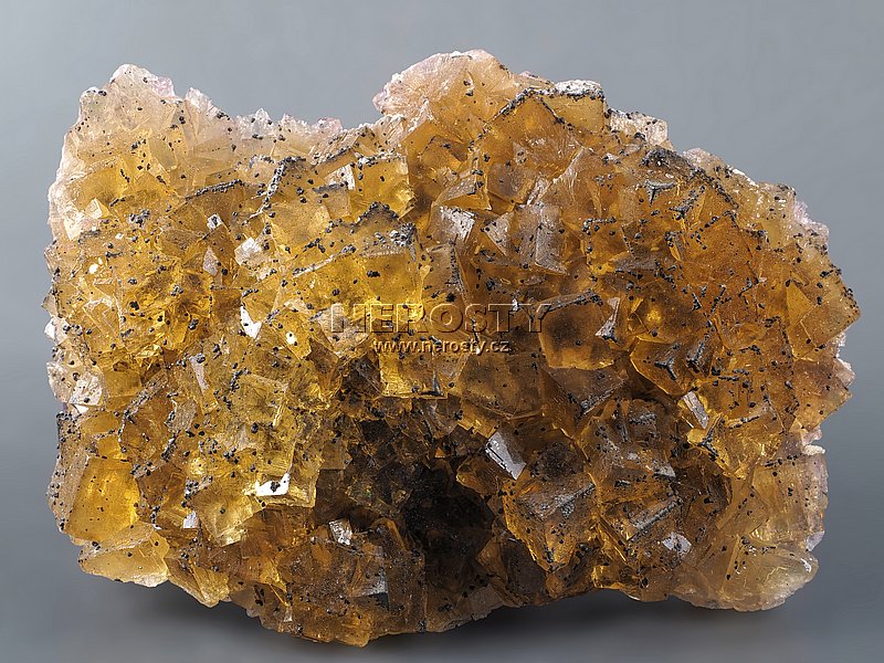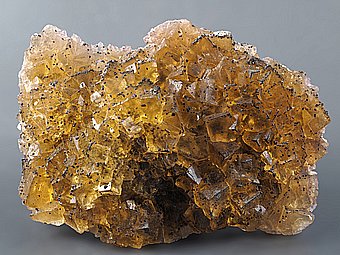 Dlaňový vzorek porostlý krystaly průhledného žlutého fluoritu .Drúza je tvořena čirými lesklými sytě žlutě až žlutooranžově zbarvenými krystaly fluoritu o velikosti do 15 mm. Na některých jsou narostlé drobounké tečky pyritu.