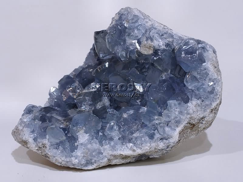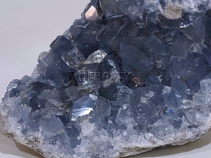 Dutina (geoda) vyplněna velkými blankytně modrými krystaly celestinu. |