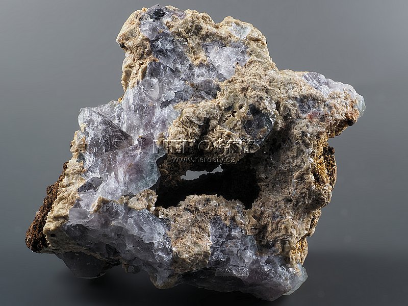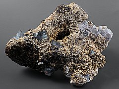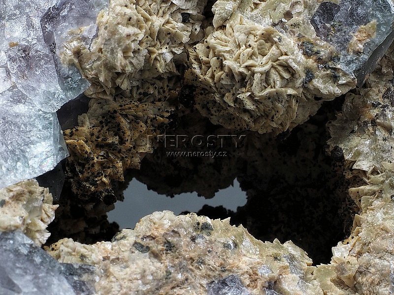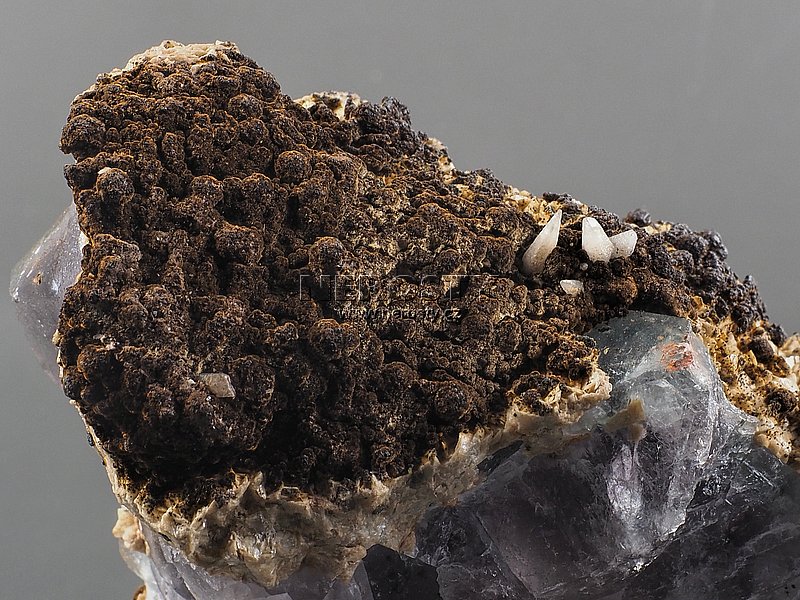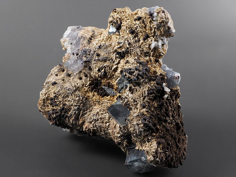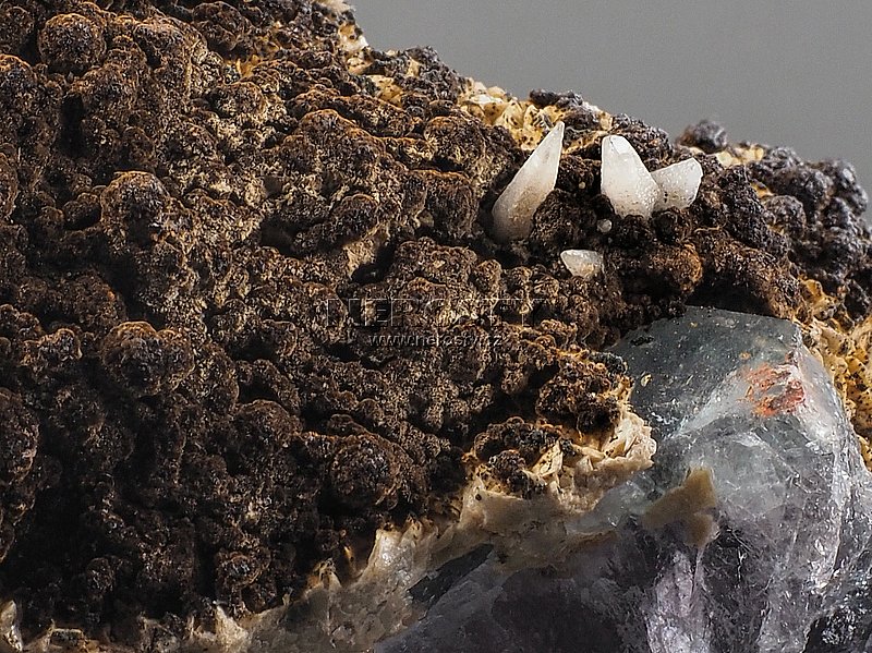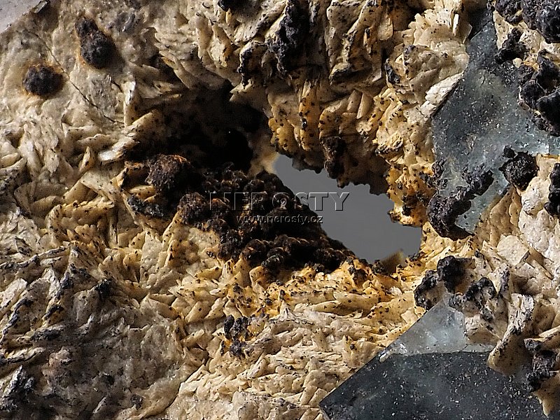 Drobné sférické agregáty zlato-hnědého goethitu nasedající na podložku tvořenou lupeny sideritu a krystaly modro-zeleného fluoritu. Velmi neobvyklá kombinace. |