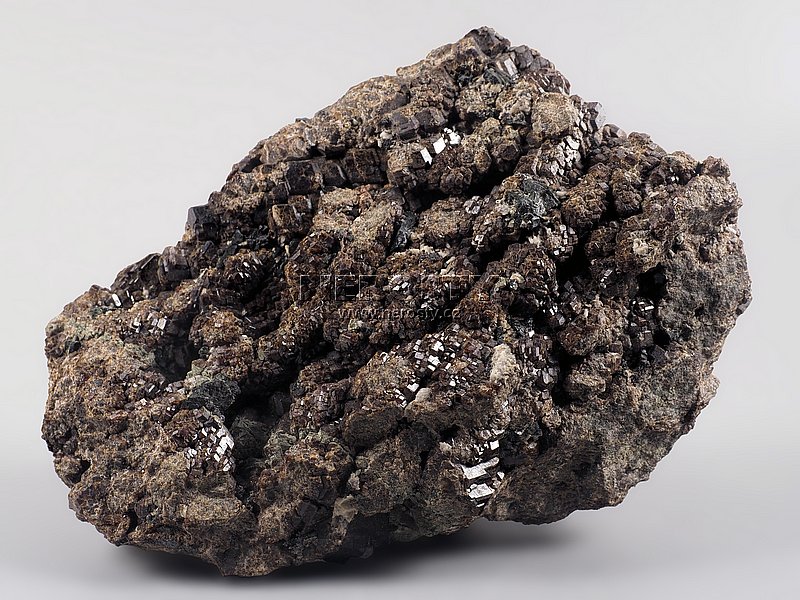 Relativně bohatý vzorek olivově hnědých krystalů grosuláru.Grosulárové krystaly o velikosti do 1 cm jsou na puklinách masivního granátovce z obou stran. Vzorek je volně stojící.