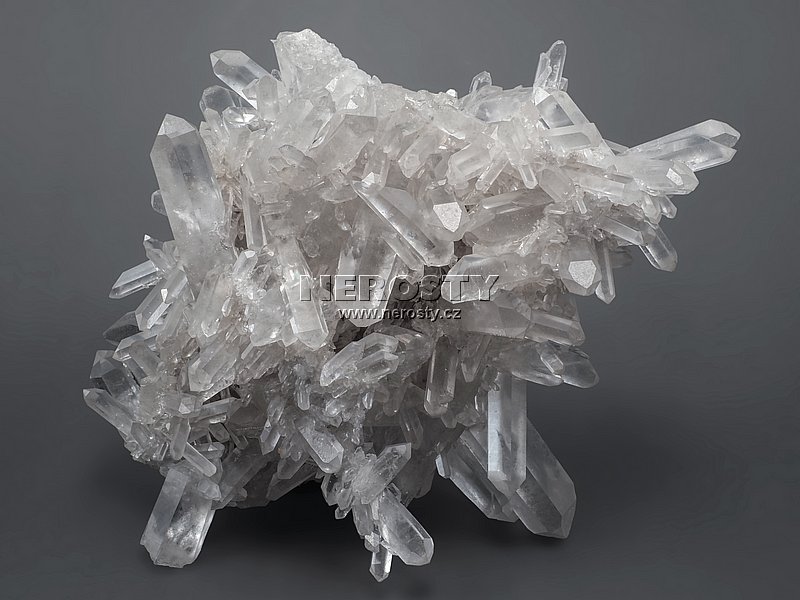 Pěkná prostorová drúza z čirých krystalů křišťálu.Na malé podložce tvořené jemnozrnným šedým křemenem jsou narostlé do všech stran trčící krystaly křišťálu o délce do 4 cm. |