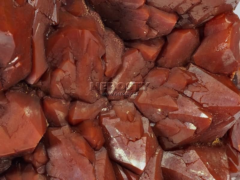 Excelentní drúza červených lesklých krystalů křemene. Špice krystalů jsou velké zhruba 2 cm.