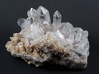 Elegantní křišťálová drúza ze severoamerického Arkansasu.Z ploché křemenné podložky vyrůstají ledově čiré krystaly křišťálu. Největší z nich je dlouhý téměř 5 cm. Krystaly jsou u jejich báze lehce mléčně zakalené. |