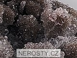 Třpytivý vzorek zajímavě rostlého a prostorově členitého křišťálu v kombinaci s ametystem.Z podložky, tvořené směsí křemene a chalcedonu s příměsí chloritu, ční do prostoru klky porostlé drobnými krystaly křišťálu. Na křišťál později narostlo několik zhruba 1 cm velkých kvítky připomínajících drúziček složených ze světle fialových krystalů ametystu. |
