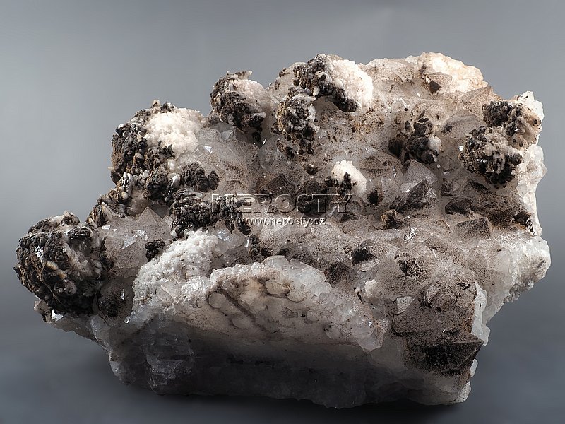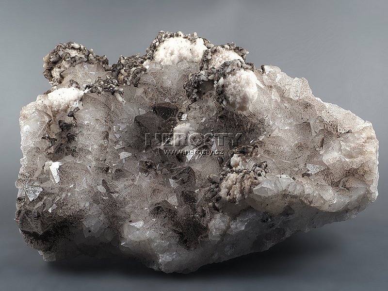 Větší dekorativní vzorek křemene na fluoritu.Na ploché podložce tvořené směsí křemene a fluoritu jsou narostlé nízce prizmatické krystaly křemene v kombinaci s pyritem a kalcitem. |